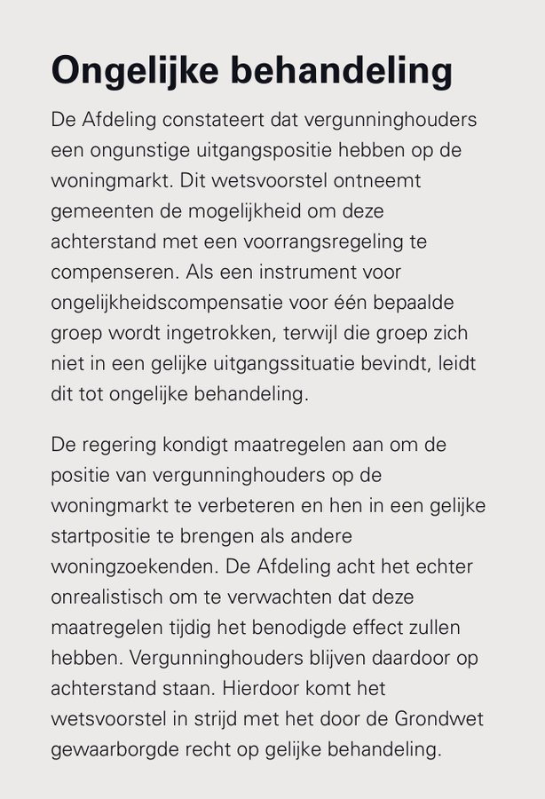quote:Welke grond voor urgentie hebben zij dan die hen voorrang boven de gewone woningzoekende zou moeten geven? En hoe leidt een, verondersteld, verschil in positie tot rechtsongelijkheid in handelen door de staat? Volgens mij wordt daar een sprongetje in het denken gemaakt om tot de gewenste politieke uitkomst te komen. Het gaat mij iig boven de pet. Overigens vind ik dat gehele urgentiesysteem uiterst politiek en onrechtvaardig. De RVS is momenteel zoveel adviseur van de regering als hoogste bestuursrechter over wetten van diezelfde regering. We zien hier allemaal de onwenselijke dubbele pet. Maar Thom de Graaf (D'66), voorzitter afdeling Advisering, zegt met droge ogen dst hij niet heeft gelezen waarom dit onwenselijk zou zijn. Die man is ter kwader trouw. Haat is een deugd! https://www.last.fm/user/kwellie |