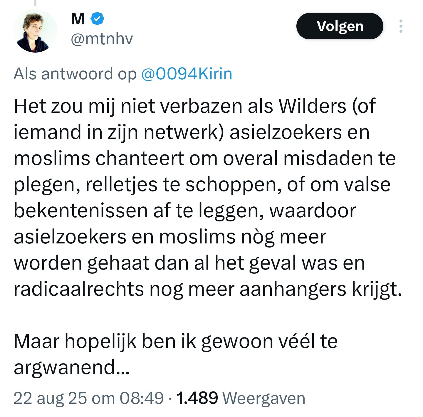 quote:Er zijn natuurlijk genoeg misdrijven die geheel weloverwogen en rationeel worden gepleegd. Denk alleen maar al aan vermogensmisdrijven. Gezien het vermeende structurele karakter alhier, kunnen we moeilijk van een opwelling spreken. Alles duidt erop dat deze man doelgericht te werk is gegaan. Daarnaast kennen we natuurlijk legio voorbeelden van migranten die voor vrijheid, veiligheid, zekerheid en welvaart hierheen ‘vluchten’, om vanaf de bank te gaan klagen dat Nederland teweinig rekening houdt met hun land van afkomst. Dat er hier opeens volgens de klok moet worden gewerkt, vrouw en dochter opeens wel heel veel vrijheden krijgen, het toch wel heel vervelend is dat autochtonen niet meevasten tijdens Ramadan, en dat het een raciestiese belediging is dat er geen rekening wordt gehouden met alle gekkigheden van Mohammed. Het is ook daarom dat de woorden van Halsema zo leeg en cynisch zijn. Eigenlijk gewoon een middelvinger in het gezicht van de slachtoffers en hun nabestaanden. Dagelijks is zijn bezig met moslims en migranten te appeasen, te erkennen dat Nederland te wit [Blank] is, dat er te weinig rekening met hen wordt gehouden, en ze vooral hun gang moeten kunnen blijven gaan met het opeisen van hun, veronderstelde, rechten en ruimte. Dagelijks maakt zij het mogelijk dat die vrijheid en veiligheid van en voor vrouwen, waar zij heel heilig de mond van vol heeft, verder erodeert door excessen uit vrouwonvriendelijke culturen te bagatelliseren. Haat is een deugd! https://www.last.fm/user/kwellie ![]() |